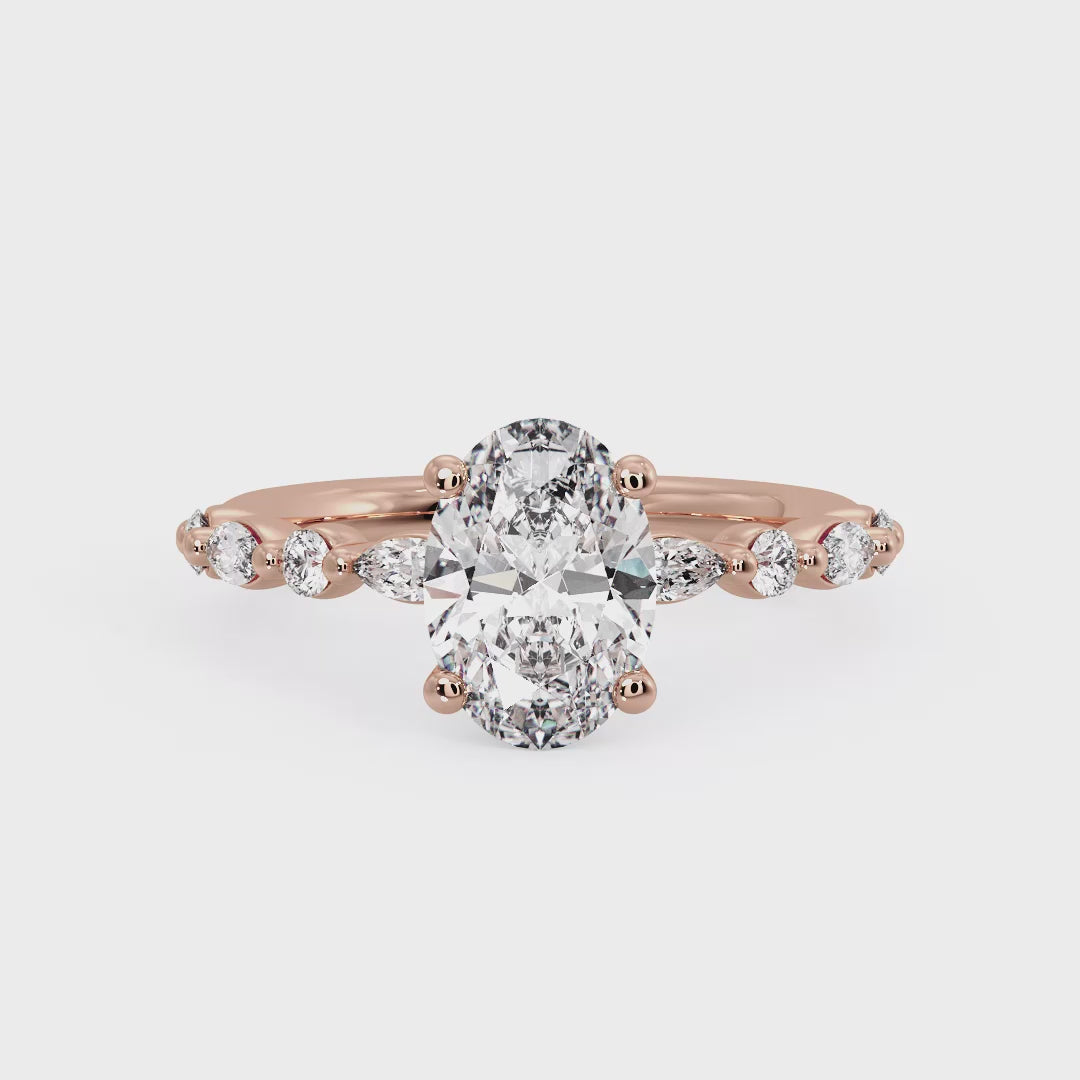 Anillo solitario de corte ovalado con 6 piedras laterales - Oro rosa