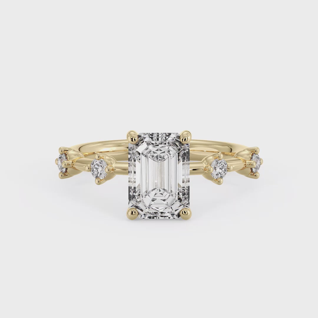 Anillo solitario de talla esmeralda con 4 piedras laterales - Oro amarillo
