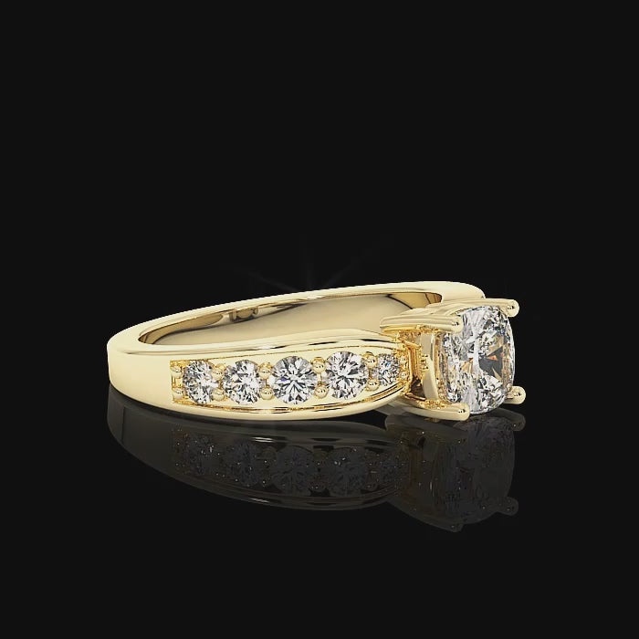 Cushion Cut ring with graduated shoulder stones- Yellow Gold
